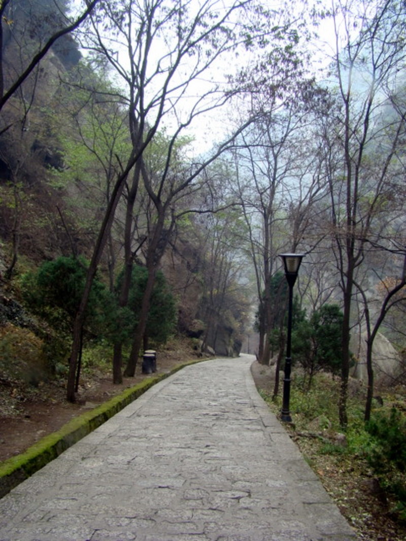 21日早上起床后第一个坏消息,是手机备用电池没充满电。原来墙插电路和电视相连,关闭电视电源后墙插也没电。这破宾馆。第二个坏消息是——出门一看,下着小雨!晕,昨晚查的天气还是晴。没办法,和临时搭伴爬山的伙计一起,急急忙忙去火车站坐8点发车的游1。游1在火车站广场东侧,很好找。从西安到华山近两个小时的车程。下车十几分钟步行到玉泉路,在山下小超市买了手套后,爬山开始啦。爬华山手套是必须的,因为华山路险,爬的过程中需时刻抓住路边冰冷湿滑的铁链。