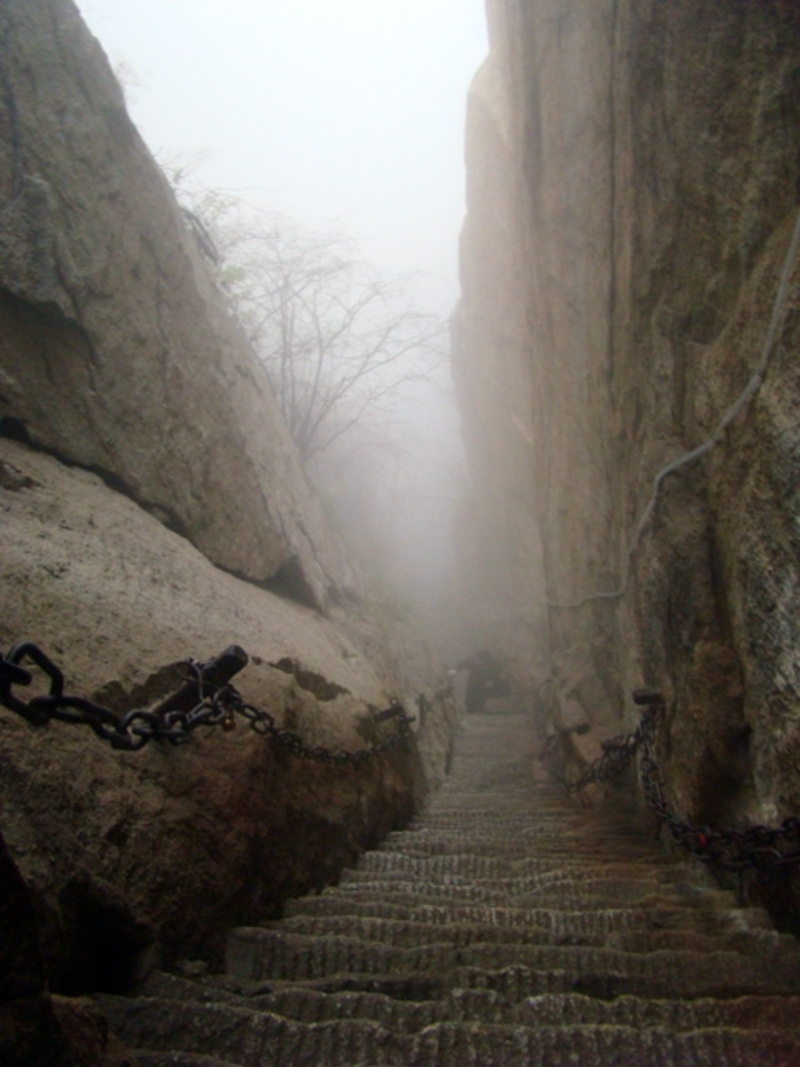 第一个险处,千尺幢。千尺幢是一处在山崖极陡处开出的一条小路,共370多磴石级,石级的宽度只能容纳一个人上下,两旁挂着铁索,人们手攀铁索,一步步向上登,往上看,只见一线天开;往下看,就像站在深井上。千尺幢的顶端,就像井口一样。这里的崖壁上刻有“太华咽喉”、“气吞东瀛”的字样。其形势真像咽喉一样的险要。这样照片是一手紧抓铁链,一手拿相机,战战兢兢地向下拍的。