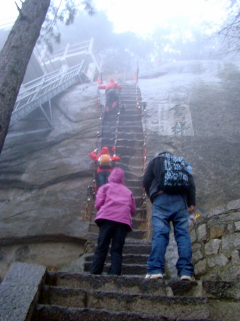 到北峰还好,过了北峰体力渐渐不支,照相兴致渐无。到天梯的时候,向上爬了几级,复退下来,绕道上去了。太累了,对自己能否上去没有信心。步伐越来越重,走几十级台阶就要停下喘气。越往上,雾越大,雨丝也见稠密,台阶变得湿滑,两边景色,全朦胧一片。