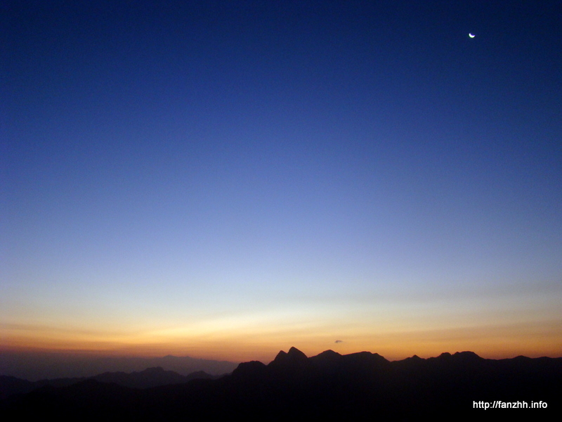 时间尚早,天边刚刚露出一丝鱼肚白。皎洁的弯月挂在东边天空,天上还有星星。在相机取景器里试了下,日出的时候正好可拍到日月同辉。等到星星渐渐自东向西依次隐去,天色渐亮,大家发现东面地平线上堆积着云彩,意识到看不到日出了,禁不住都有些失望。