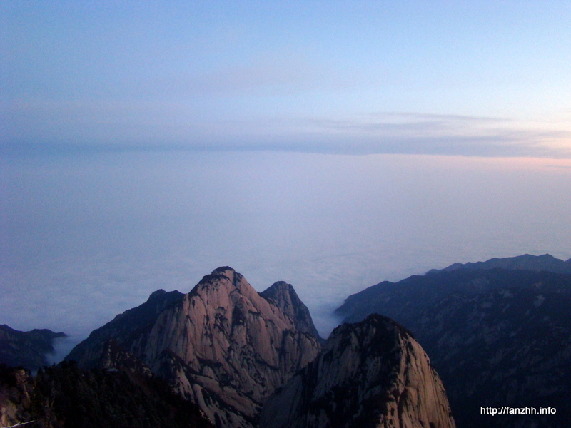 5:50,被手机闹钟叫醒。窗外还漆黑一片。摸黑穿衣服,并喊同伴起床。屋里其他人听到动静醒了,听说天晴了,也都陆续起来。很冷,宾馆有军大衣出租,40元一件。为要不要租一件纠结了一会儿,还是决定不租抗过去。观日台就在东峰西侧,上面已经有人语声。台阶上有积雪,很滑,上时需紧紧抓住铁链,一步踩踏实以后,才敢迈出下一步。观日台上已经聚集了七八个游客,三三两两聚在一起瑟缩着聊天呢。