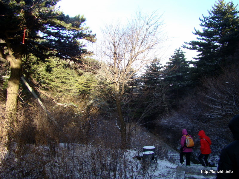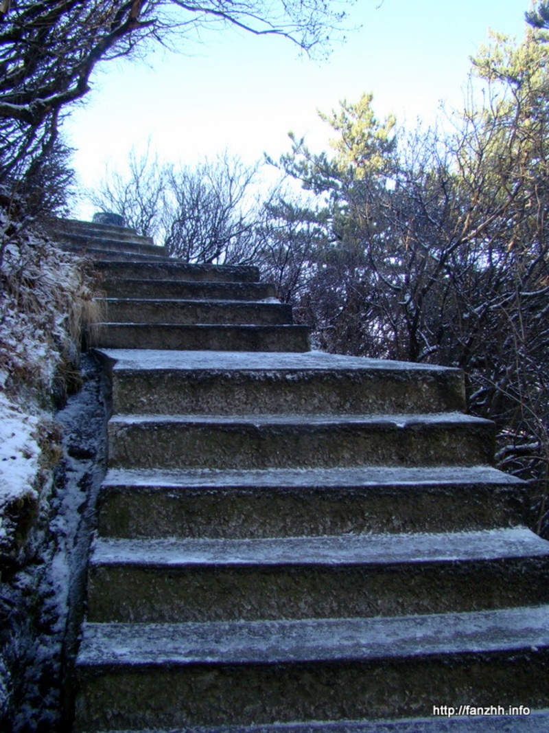 此时石阶上一层薄雪,已冻住,又硬又滑,每走一步必须全神贯注,倍加小心,险处甚至四肢并用。好几次差点滑到。