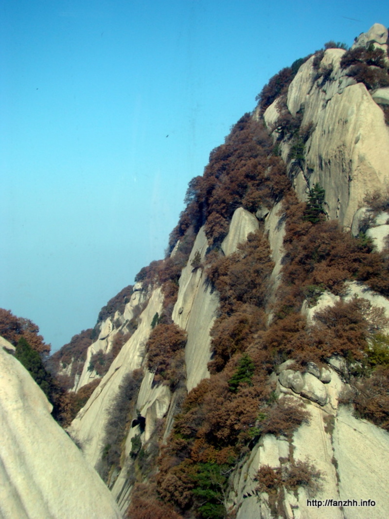 开始下山啦。原计划是取智取华山路下山的,太累了,改主意到北峰做索道下山。下到北峰的路上不时碰到精疲力尽的游客问我们:到其他三个峰还有多远?我们说:不远,半小时。后来赶紧纠正:得一个多小时。我们下山轻松半小时的路程,他们上山一小时能走到就不错啦。嘿嘿,回想昨天上山的时候,我们也是这样问迎面下山的游客的,老感觉上山的路长的没完没了的。