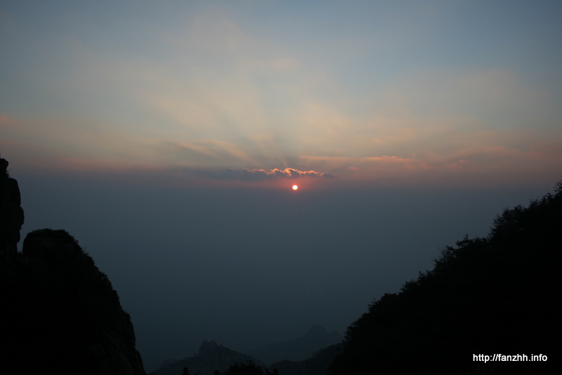 约5点到了观鲁台,在这儿等待看日出估计有百人左右。天还黑着,我们先找了个墙跟坐下避风。昏暗中看清这是两个石屋的夹角,头顶一棵不知什么树,枝叶稀疏。夹角往里地面斜坡着升高,地上不知是堆积的碎石块还是垃圾。一个伙计不知是因为冷,还是困,或者又冷又困,试图从树下钻到夹角最里面去,可惜好像夹角里已经有人了,无奈又出来,在我们面前转圈。