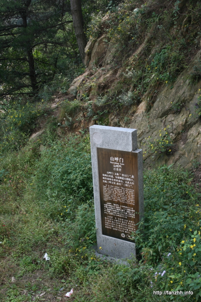 尽头有一城门楼,建在两峰之间的天然隘口上,大有“一夫当关,万夫莫开”之势。这就是望天门,据说旧时也称“山呼门”或“三呼门”。因古时帝王登封泰山后,文武百官须在此三呼万岁后跪退下山。望天门地势位置乃绝佳的观景所在。