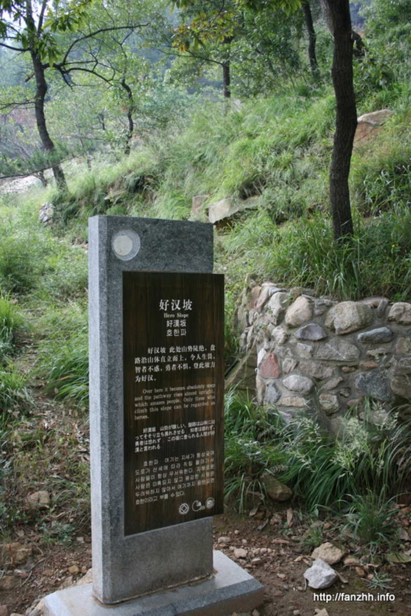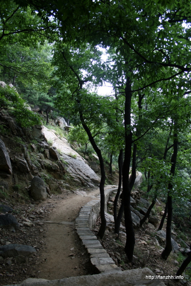 一条蜿蜒向上的石头小径,细看指示牌上写着“明代古道”。因为年久失修,看这古道并不宽阔平整,想抬着明代皇帝的辇车上山肯定不少费力气。有时间的话顺着这样的路线爬山也不错,兴许能在路旁捡到哪个皇帝随手丢弃的宝贝呢。:-)
