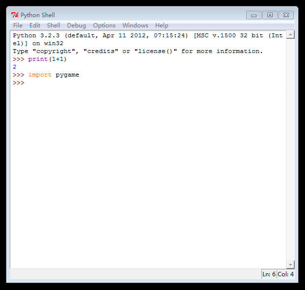 为了验证你的PyGame安装正确,打开IDLE输入import pygame并回车。如果没有返回任何结果,那么恭喜你,你的PyGame安装正确。